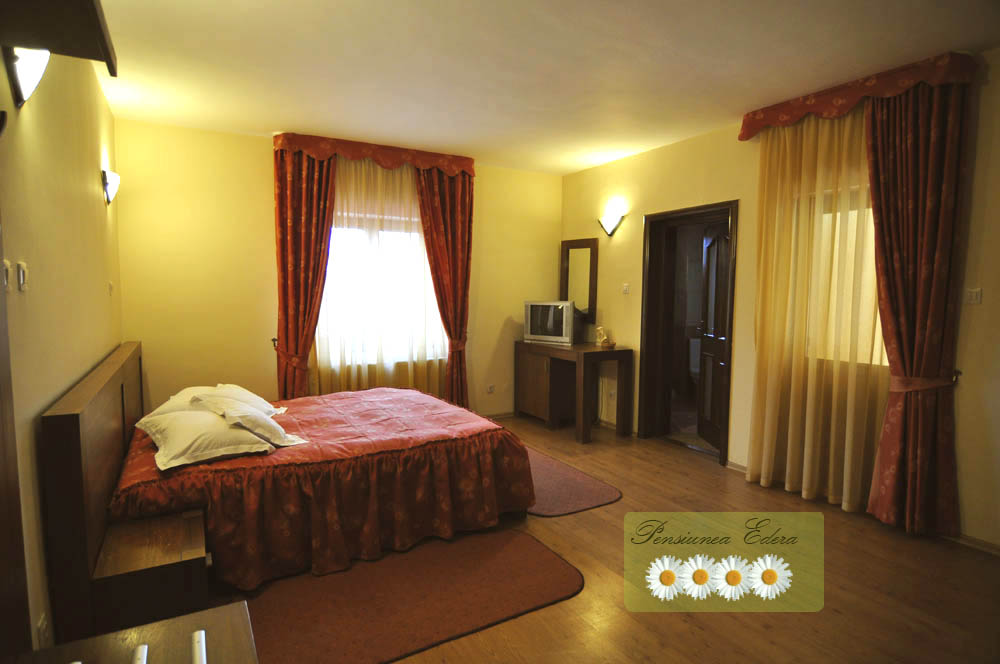 Cum se prezinta cazarea la Pensiunea Edera? Pensiunea iti poate pune la dispozitie 24 de camere, iar tu poti opta pentru camere twin, camere duble sau pentru un apartament. Daca ai in plan sa vii cu un grup numeros, suna la Receptie si inchiriaza toata pensiunea, iar distractia se va tine in lant intre prieteni!